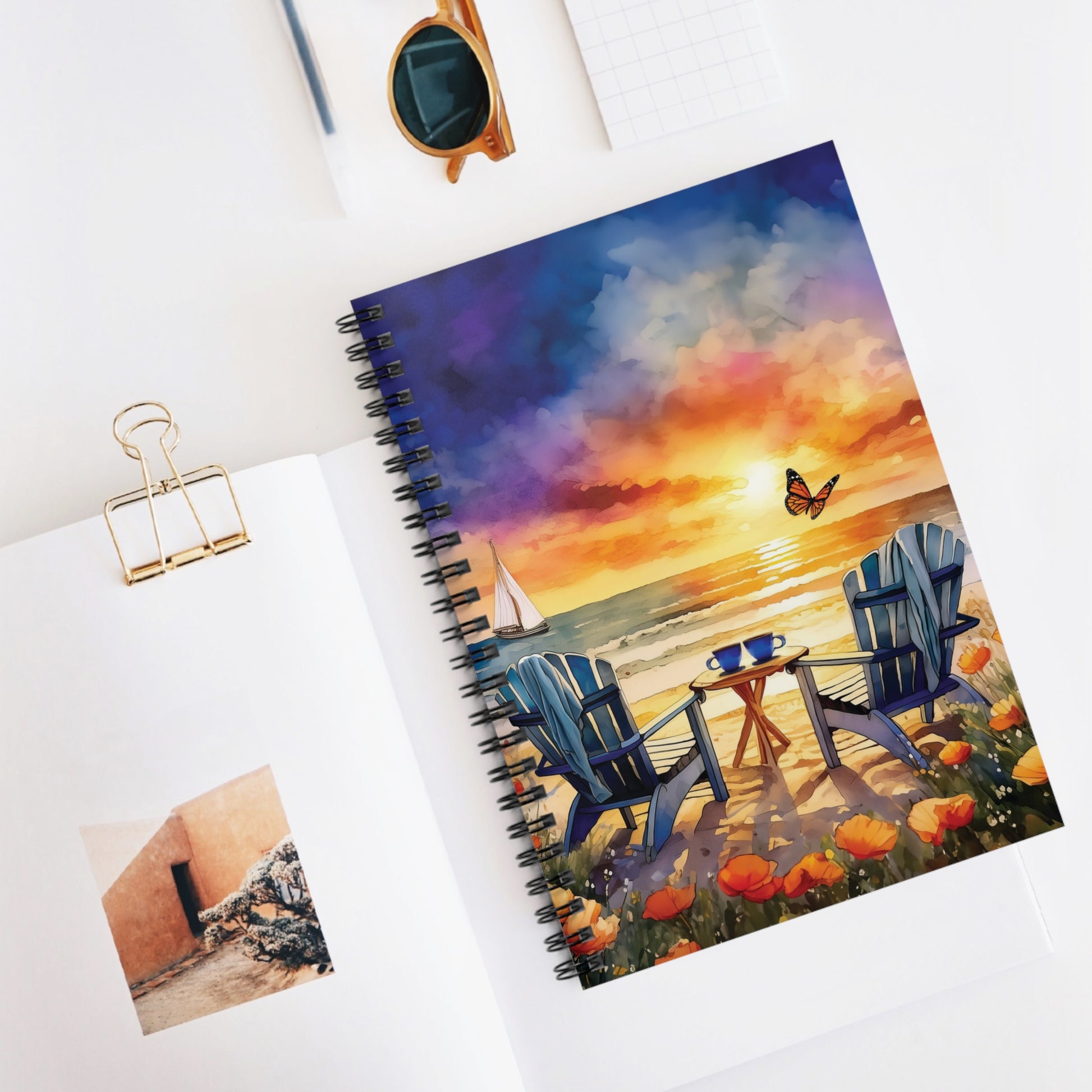A beautifully designed spiral notebook featuring a watercolor beach scene with Adirondack chairs, coffee cups, and a stunning sunset. Perfect for jotting down notes and journaling while evoking a sense of relaxation and tranquility. Ideal for beach lovers, writers, and those who enjoy capturing memories. Relevant for vacation, summer, and relaxing occasions.