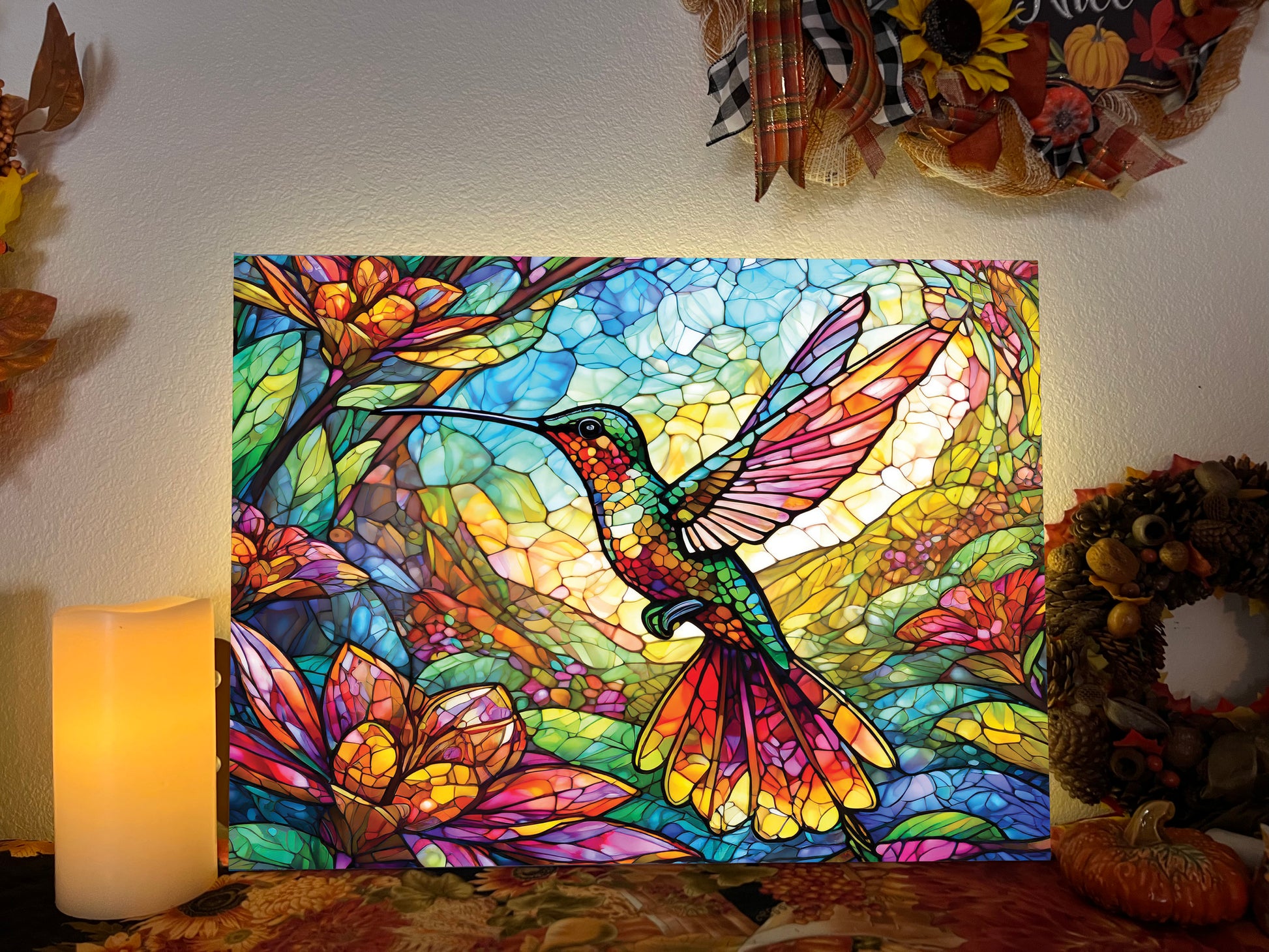 Enchant your outdoor space with this timeless Stained Glass Hummingbird artwork. The vibrant colors are sure to bring a smile to all your friends and neighbors!