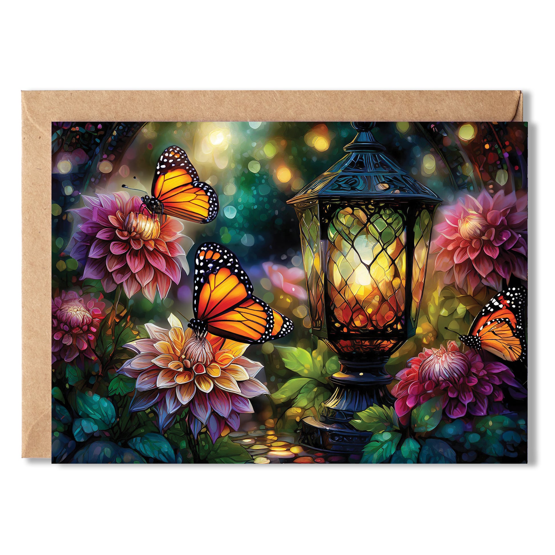 Step into a moment of pure magic with Golden Hour. Set in a dreamy twilight garden, this enchanting greeting card features glowing dahlias, a vintage lantern, and monarch butterflies dancing in warm, golden light. The colors are rich and inviting—like the peaceful hush at the end of a beautiful day.