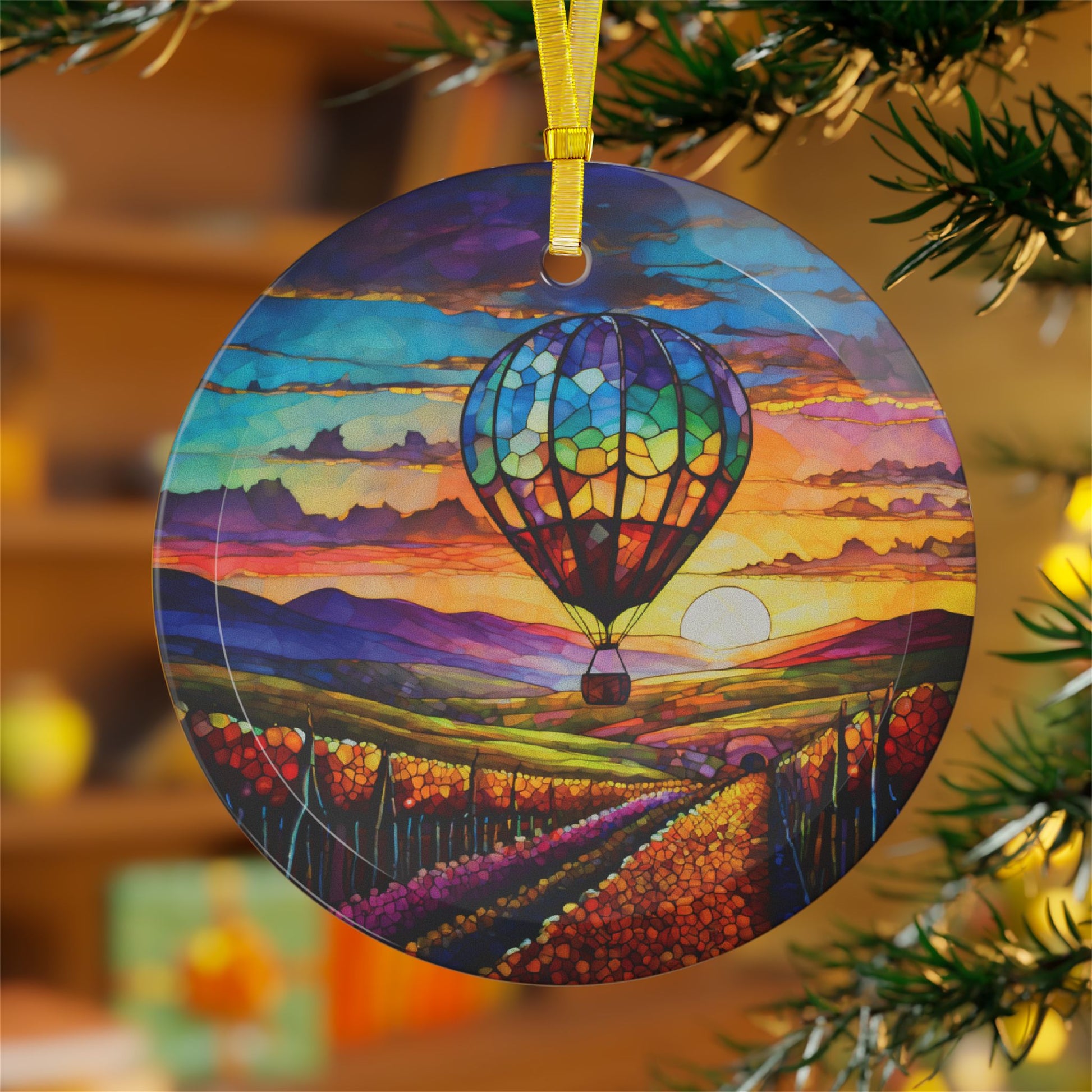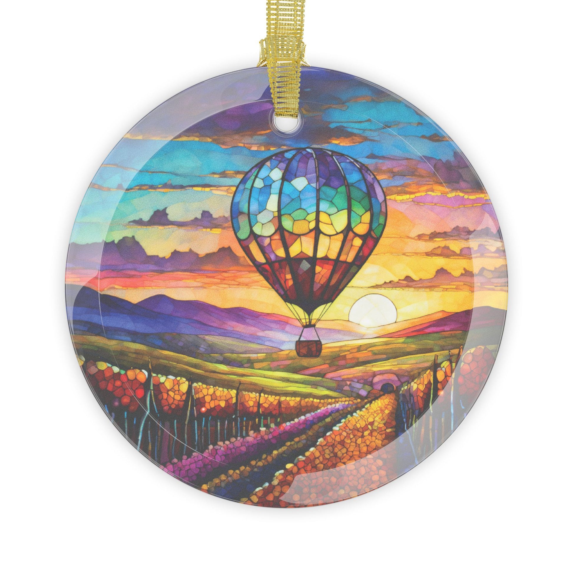 Hot Air Balloon Flying Over Wine Country Beveled Glass Ornament Light Catcher Perfect Gift for Adventurers and Wine Enthusiasts