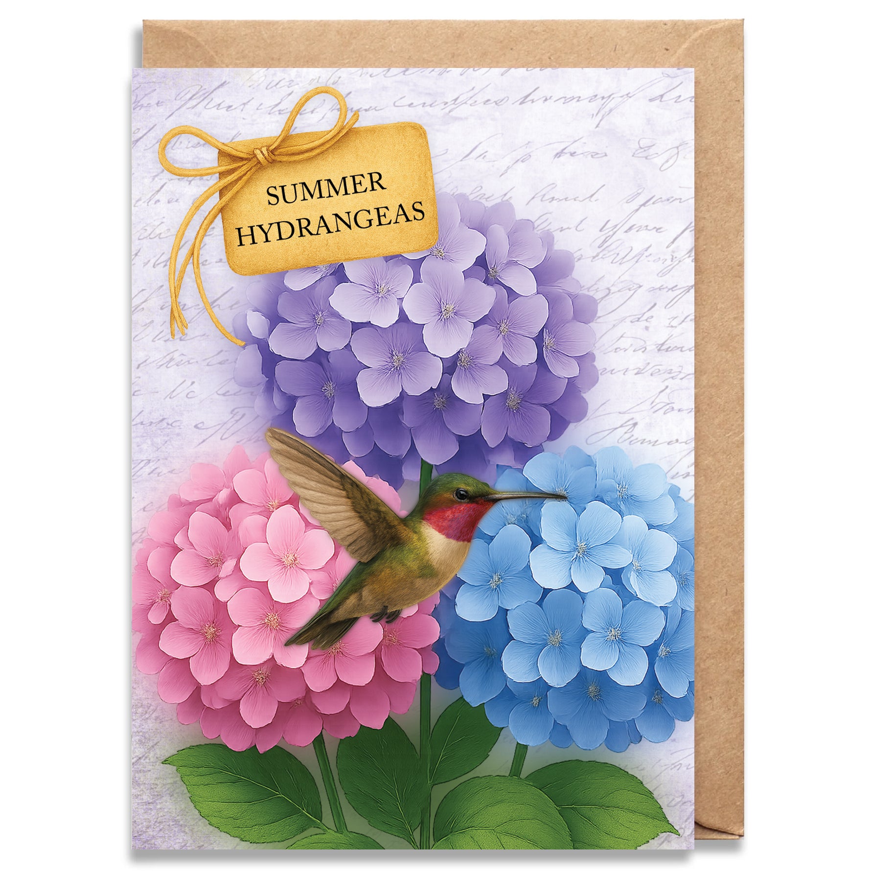 Graceful and serene, Hydrangeas features lush clusters of soft lavender, blush pink, and sky-blue blooms layered against a delicately textured, handwritten background. A pale butterfly rests gently at the center, creating a sense of calm, balance, and quiet beauty.