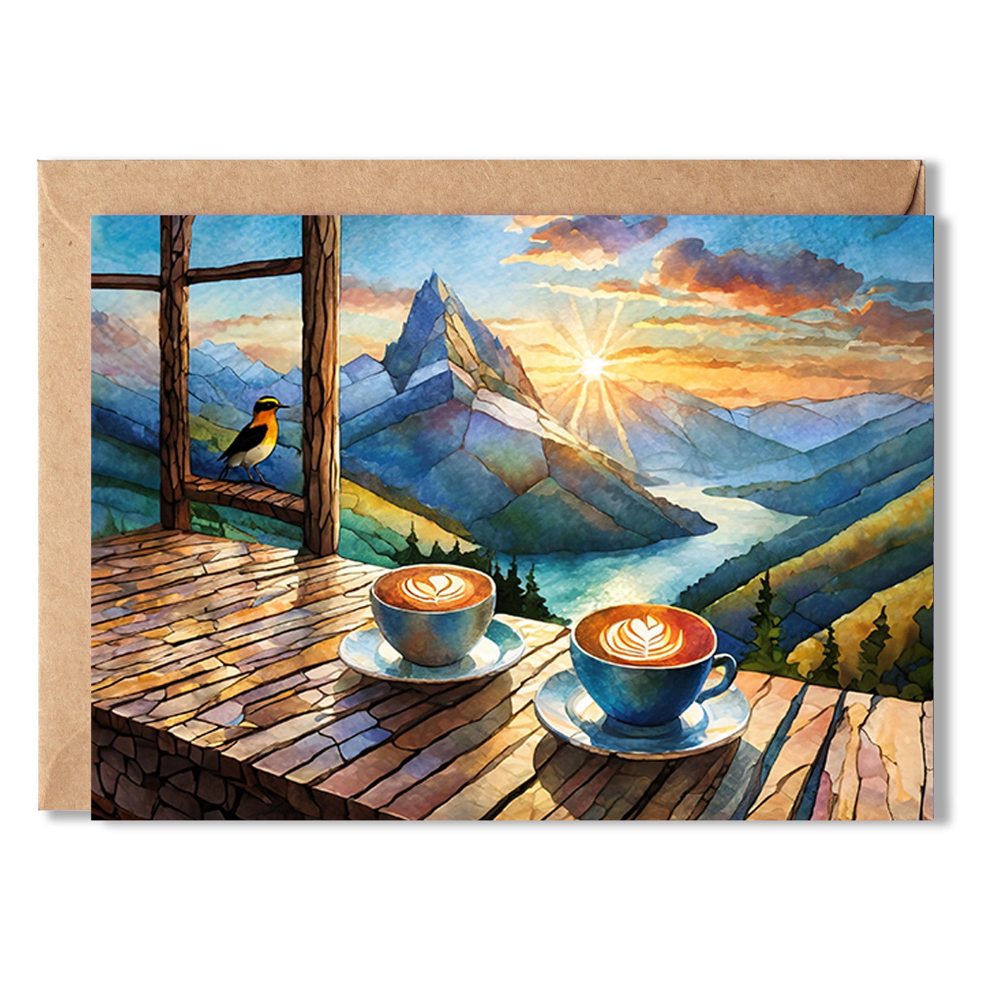 Take a breath and take it all in with Lookout View. This inspiring greeting card features two steaming cups of coffee overlooking a breathtaking mountain sunrise. With a peaceful bird perched nearby and a river winding through the valley below, this design captures the beauty of quiet mornings, deep conversations, and meaningful moments shared.
