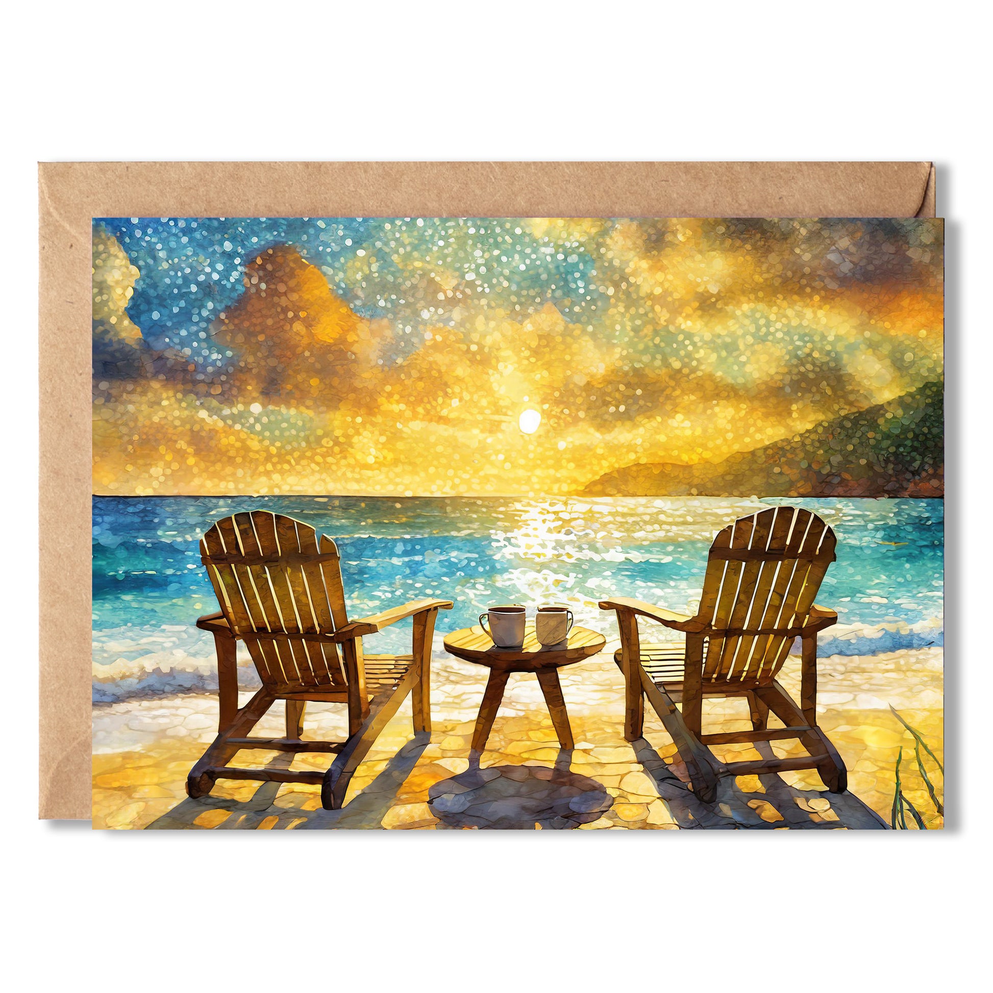 There is beauty in sharing life’s quiet moments — a sunrise, a warm cup of coffee, a peaceful heart. Morning Blessing captures that feeling of gratitude and togetherness with two chairs overlooking a golden ocean sunrise. Soft light dances on the water, inviting reflection, hope, and connection.