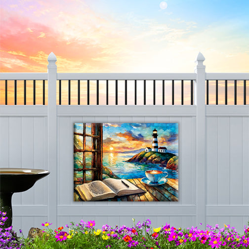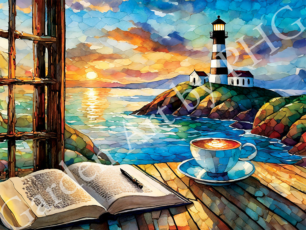 This exquisite piece captures the magical moment when the first rays of sunlight kiss the ocean, casting a golden glow over the waters with the stoic lighthouse standing guard, a beacon of hope and guidance. This stunning depiction not only brings a touch of serene elegance to your home, garden or office but also serves as a daily reminder of the boundless possibilities that each new day brings.