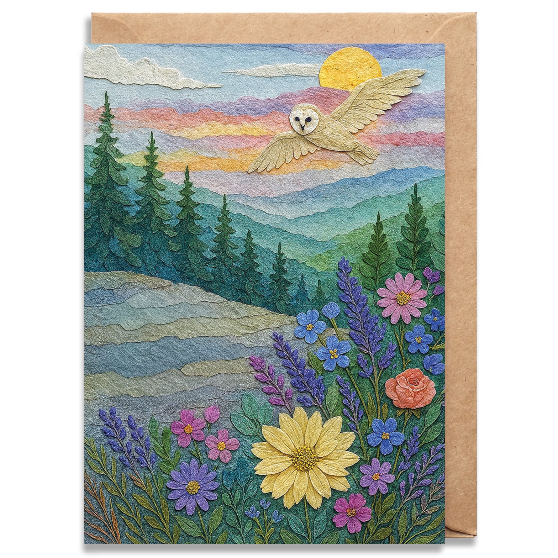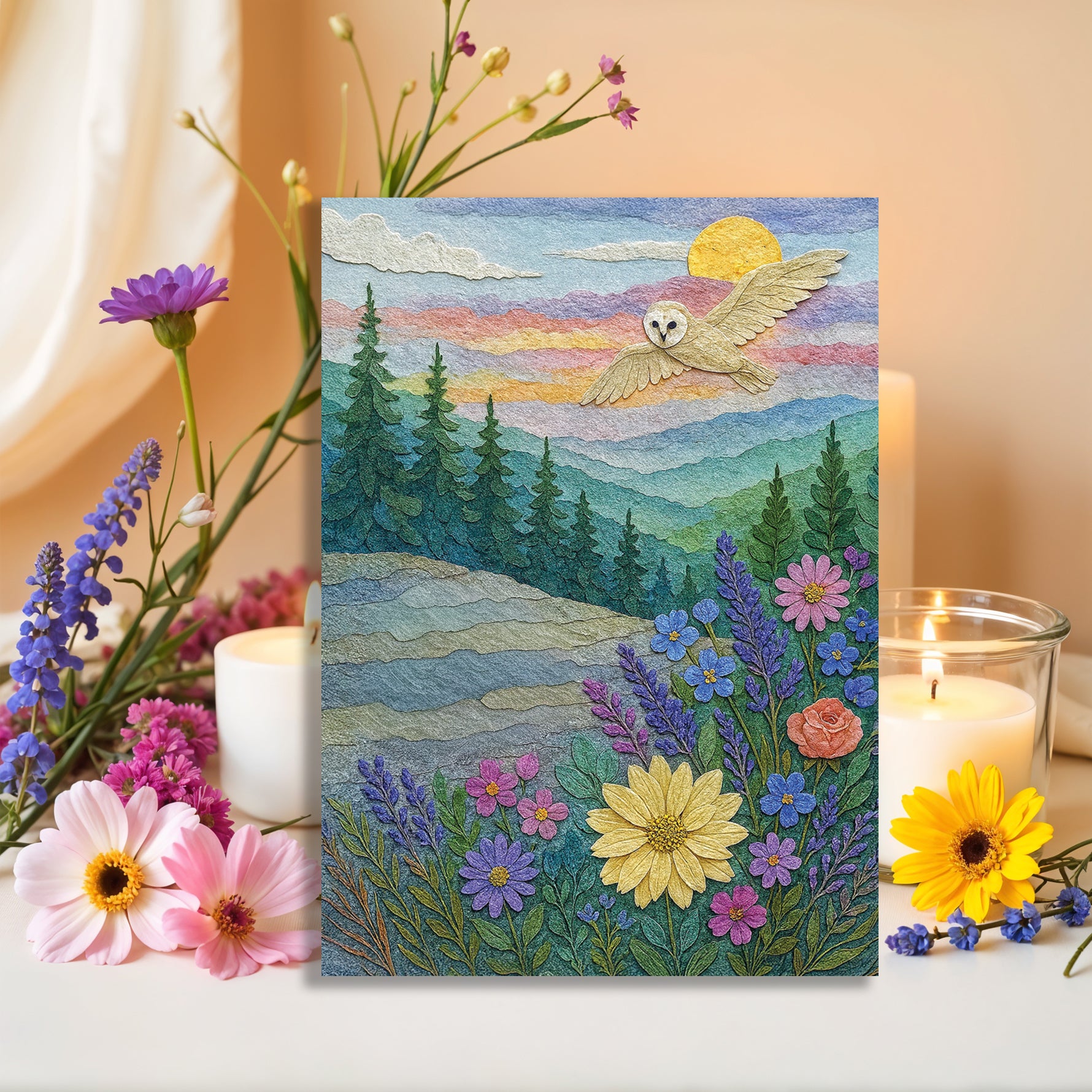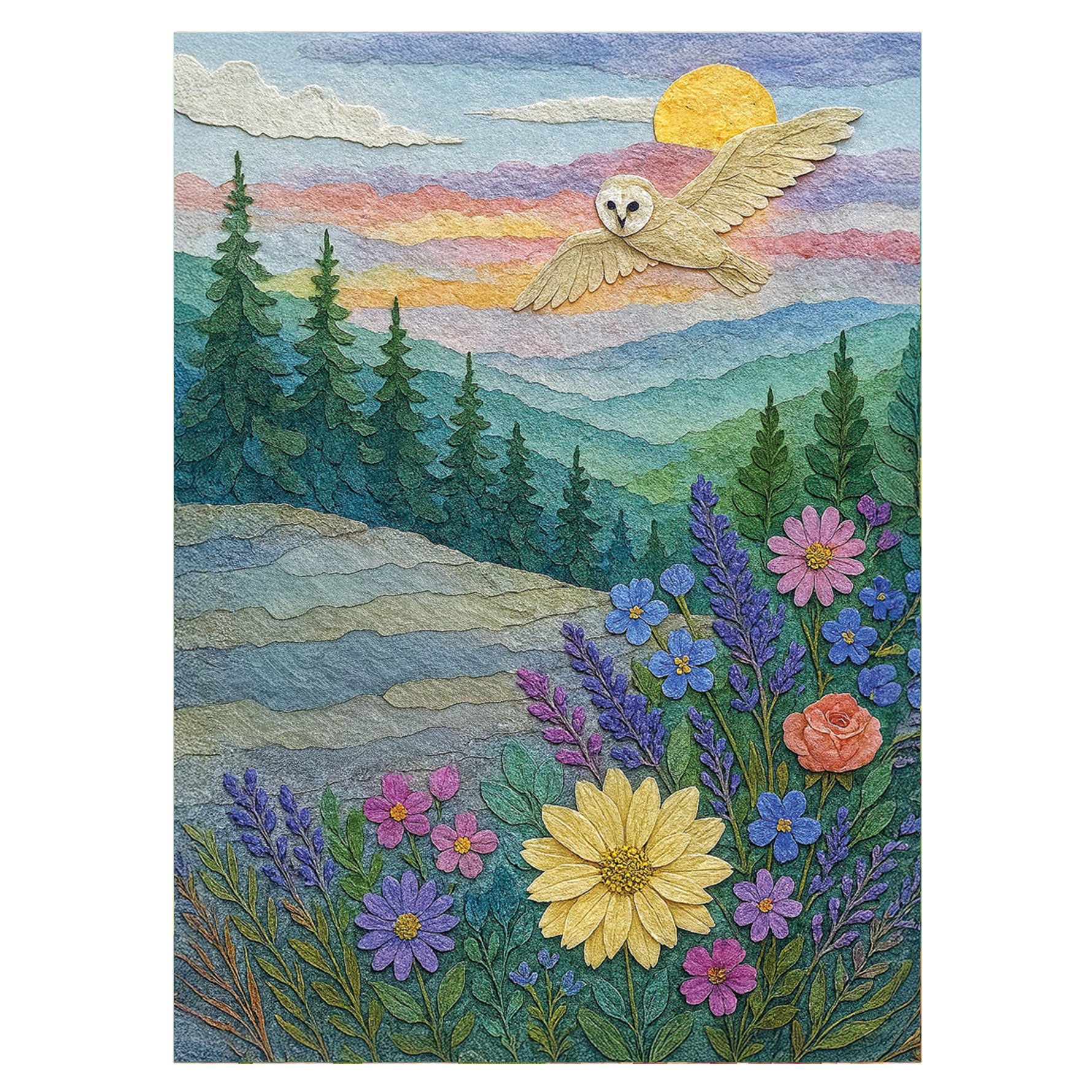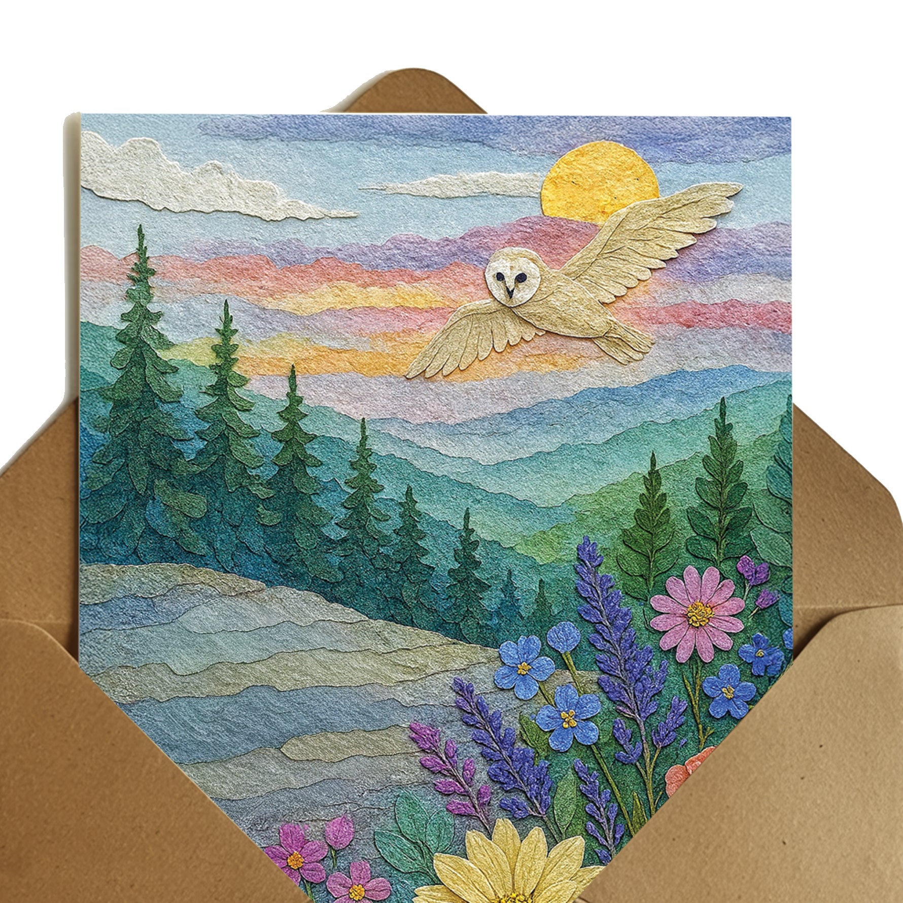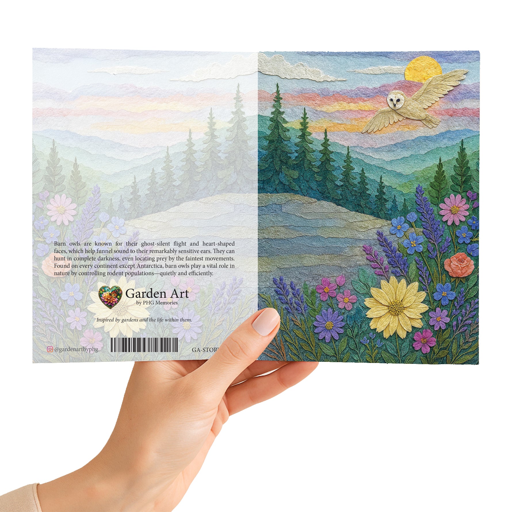 Quiet and contemplative, Morning Watch captures a peaceful moment at daybreak — a watchful owl gliding across a soft sunrise sky above layered hills, evergreens, and a garden in bloom. A warm cup of tea rests nearby, inviting stillness and reflection as the day begins.