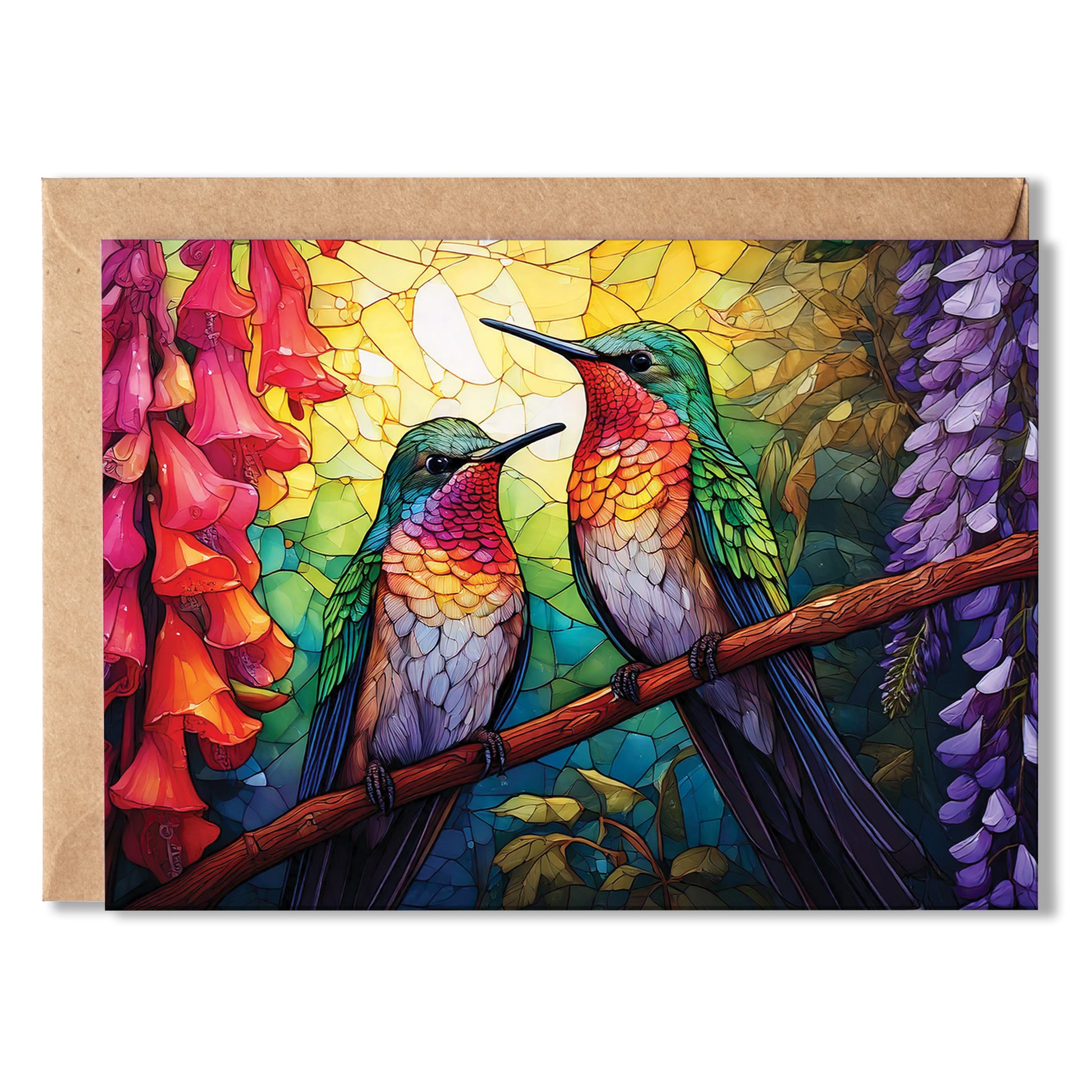 This greeting card is absolutely stunning—a true work of art that feels alive with color and meaning. The design features two radiant hummingbirds perched closely together, their feathers shimmering in jewel-toned shades of emerald, sapphire, and ruby. Surrounded by vibrant blossoms and bathed in the glow of golden sunlight, the image has a stained-glass effect that makes the whole scene sparkle with warmth and energy.