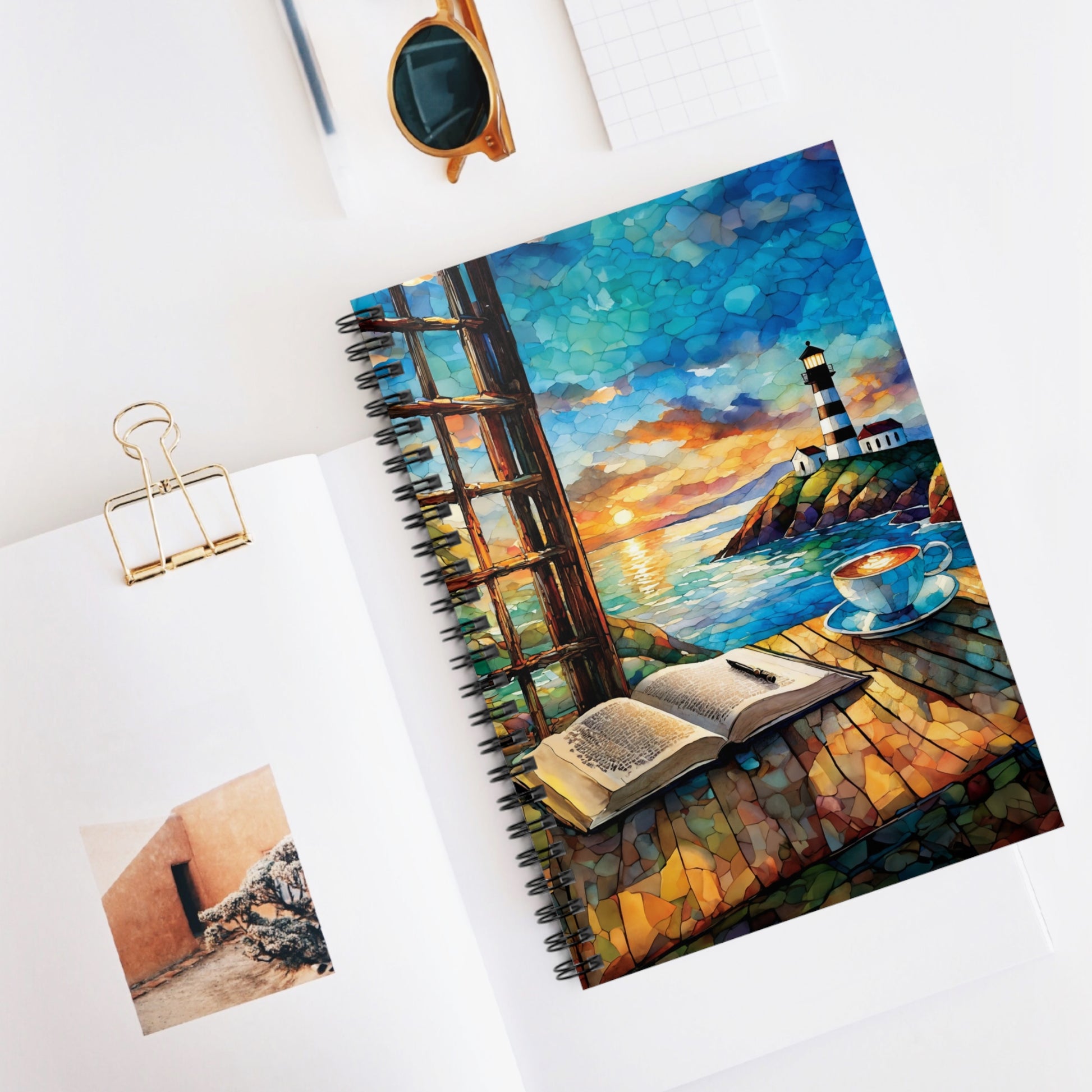 A spiral notebook featuring a nautical beach view with a lighthouse, perfect for writers enjoying a cup of coffee. This journal gives off a relaxing coastal vibe and is a great gift idea for those who love the sea and writing. Ideal for jotting down thoughts and keeping organized.