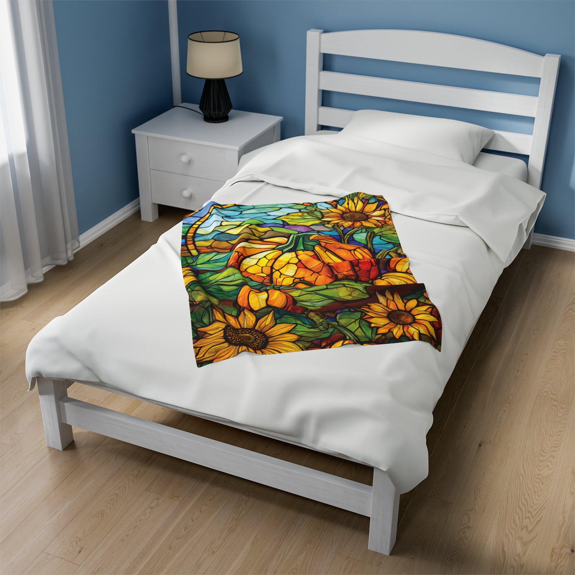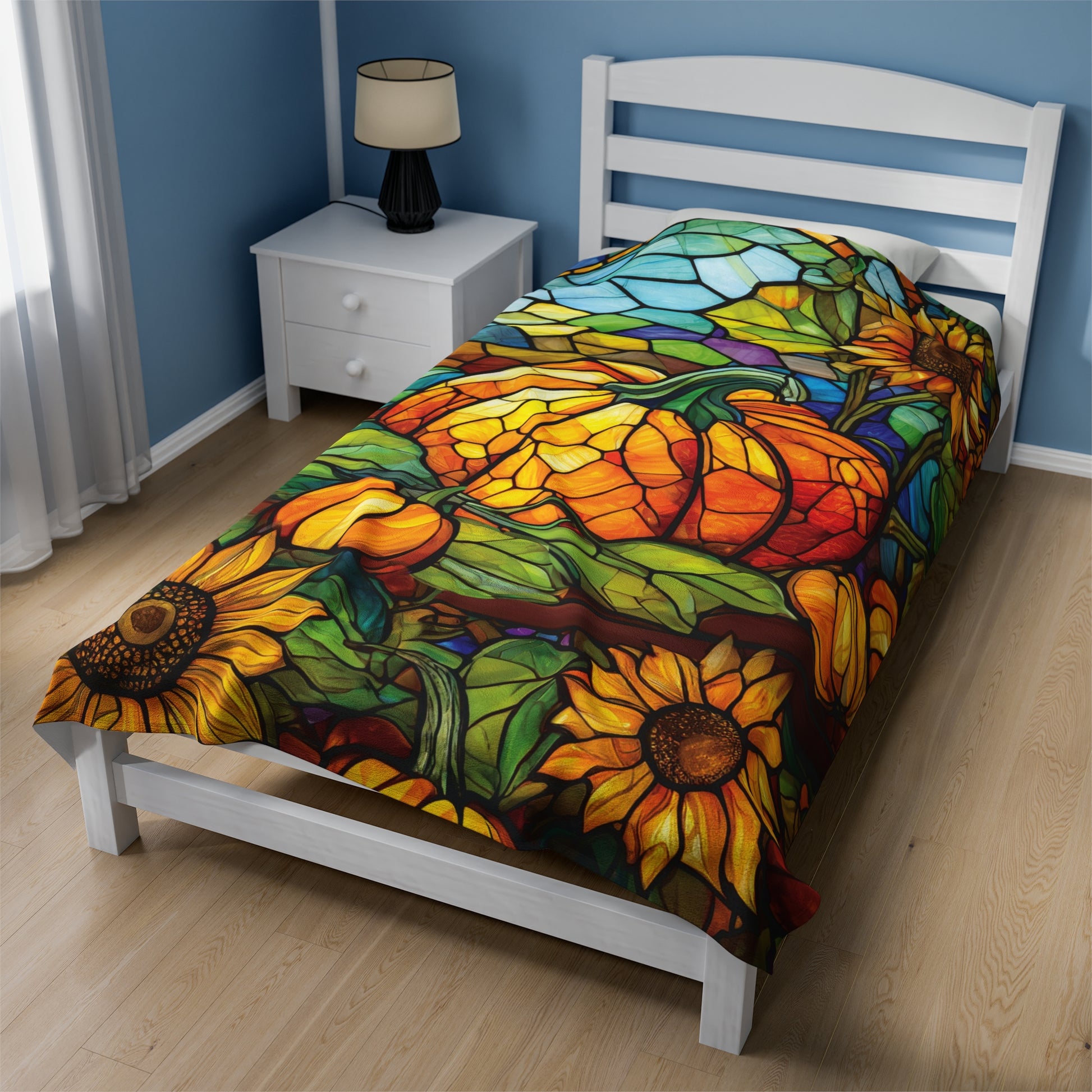 Beautiful soft plush Fall blanket featuring stained glass pumpkins in a sunflower patch. A perfect gift for anyone who longs for Fall all year long; cooler nights, the smell of cinnamon, and the changing of the leaves. Ideal for snuggling up on chilly autumn evenings or adding a cozy touch to your home decor. Perfect for Fall enthusiasts and those who love seasonal decor.