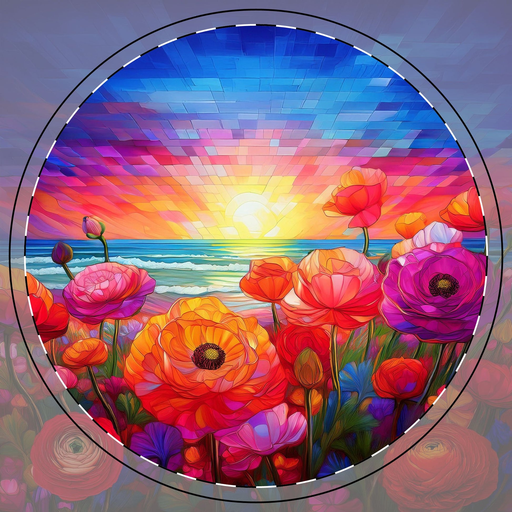 The beach is a special place where we go to slow down, listen to the waves, breathe in the cool air blowing on the coast and relax. In this beautiful stained glass image, imagine as you drink your cup of coffee or tea that you're there now just enjoying the beauty of the ocean. These beautiful Ranucula flowers are reminiscent of the flower fields in Carlsbad. This is a perfect gift for anyone who loves the coast and enjoying a beautiful sunset to end their day.
