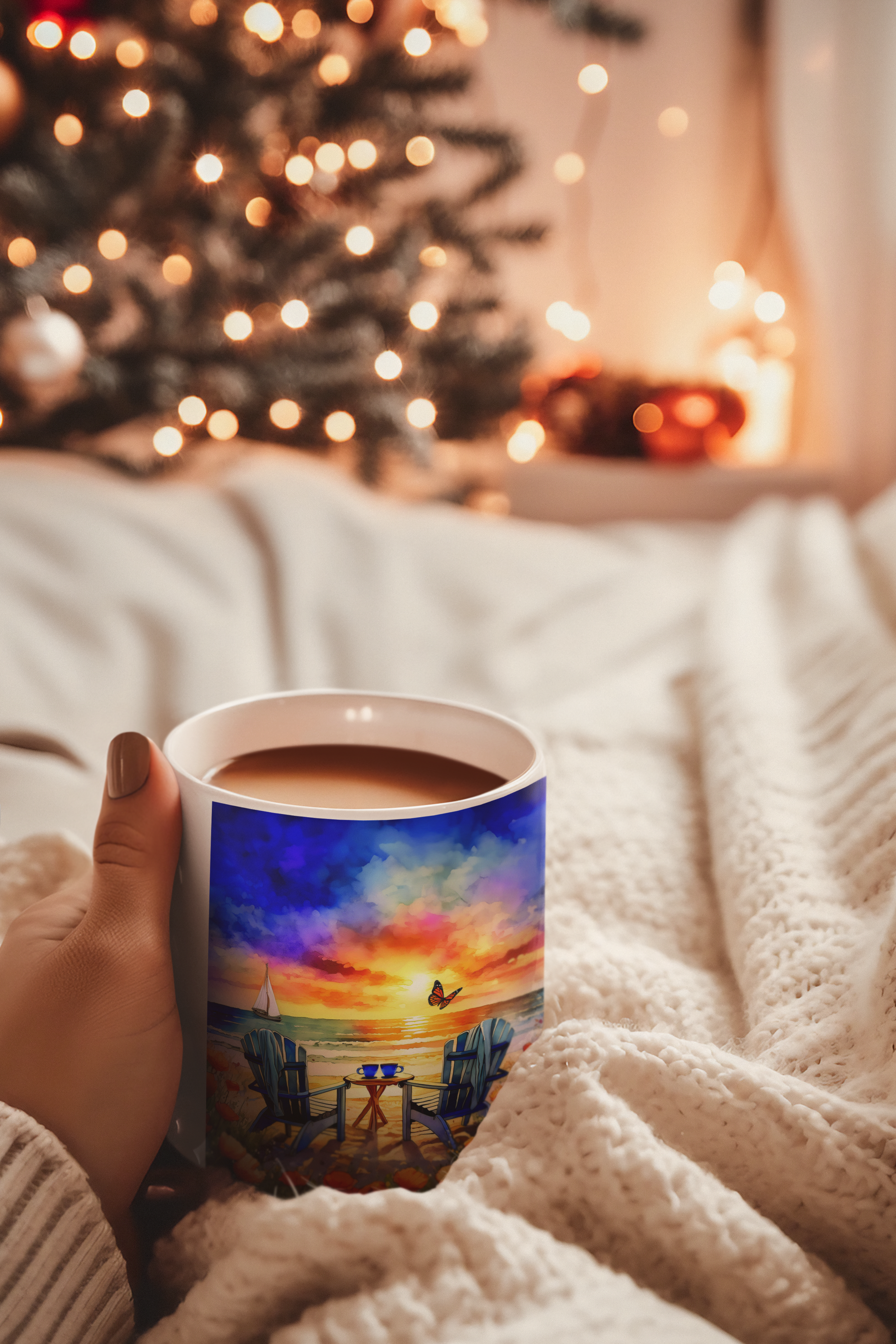 Capture the serene beauty of a perfect evening with our Beach Sunset Delight Mug. This enchanting design features two classic Adirondack chairs positioned to watch a breathtaking sunset over the ocean. The warm hues of the setting sun blend seamlessly with the tranquil sea, creating a picturesque scene that evokes relaxation and peace.