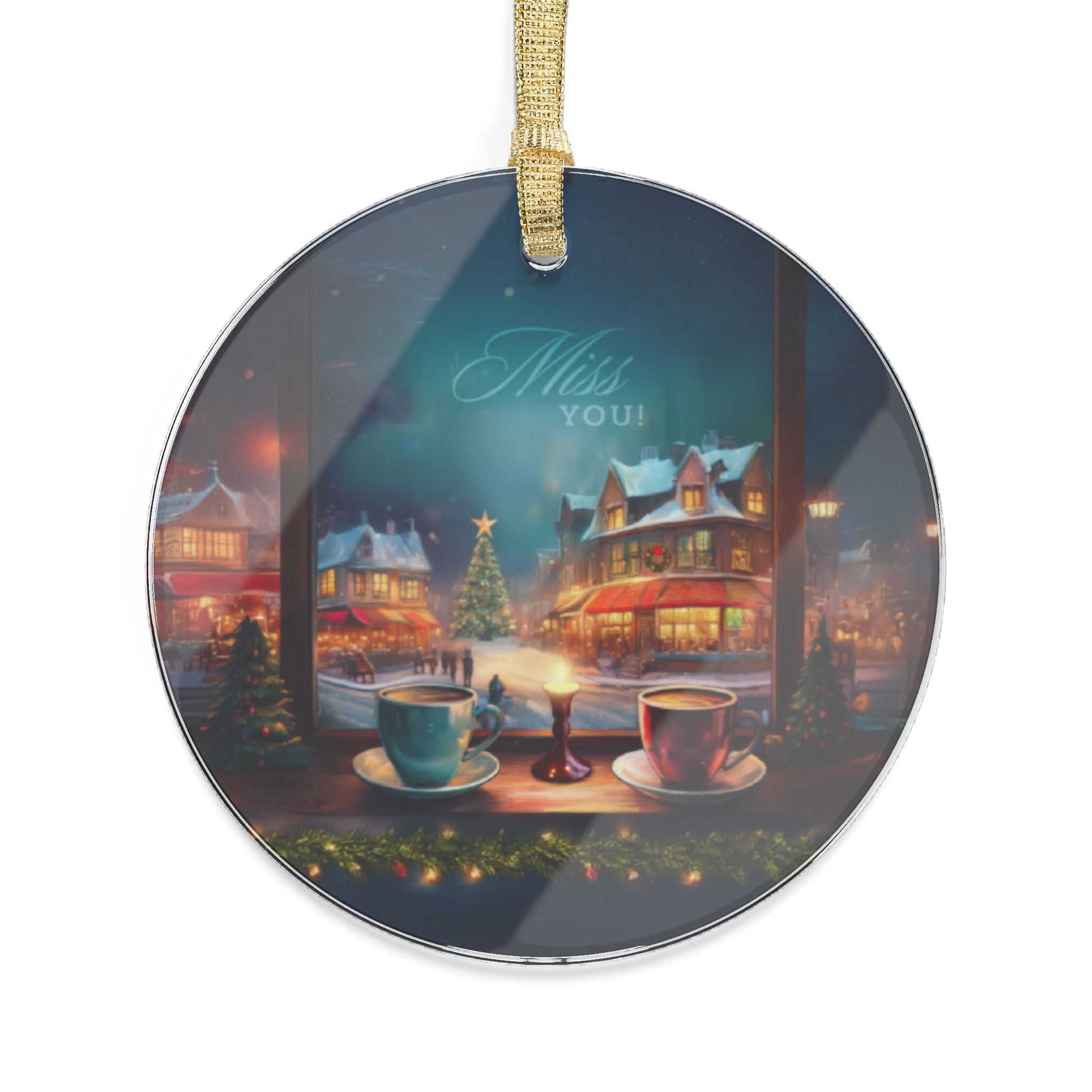 Capture the warmth of the holiday season with this beautifully crafted acrylic Christmas ornament featuring a cozy coffee shop window scene with two cups of coffee overlooking a festive Christmas village, adorned with the heartfelt message, "Miss You." This unique ornament evokes the comforting charm of a shared moment during the holidays, making it a perfect keepsake for those who are far away but close to your heart.