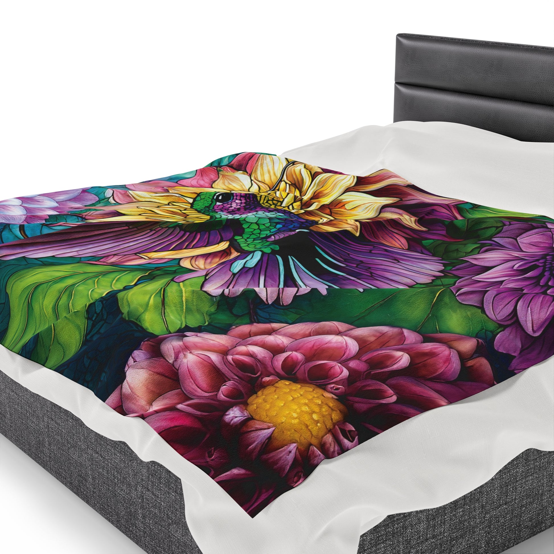 A soft, vibrantly colored velveteen plush blanket featuring a beautiful floral design with a hummingbird and dahlia flower. Perfect for any gardener or nature lover, this blanket exudes a sense of tranquility and can be a cozy addition to your home decor. Ideal for gifting during birthdays, Mother's Day, or as a housewarming present.