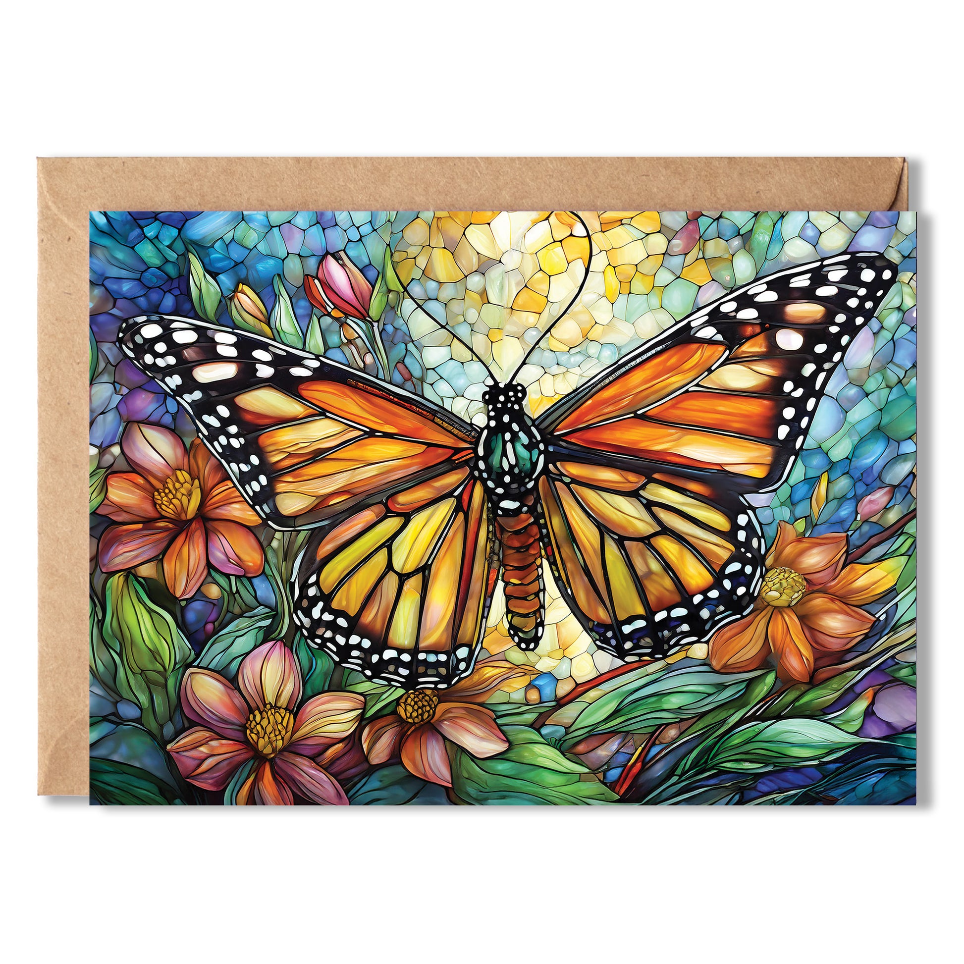 Let beauty take flight with Butterfly Dance, a vibrant greeting card featuring a breathtaking monarch butterfly surrounded by blooming garden florals. The artwork is rich with stained-glass style textures and radiant color, creating an uplifting piece that feels both elegant and full of life.